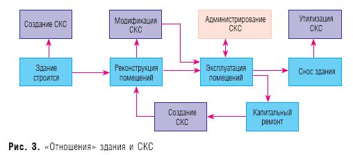 Это и владелец СКС, и организация-пользователь СКС, и владелец здания, и организация, эксплуатирующая здание, и соседи-арендаторы, и т.д. Существуют также различные законы, технические нормы, правила по эксплуатации здания, инструкции контролирующих органов (пожарники, энергонадзор, охранные организации), которые иногда меняются. И все эти факторы могут непредсказуемо инспирировать перемены в компании, а они наверняка «заденут» и СКС. Есть свои «отношения» у СКС и с самим зданием, и с этажом, и с соседними помещениями. Кроме того, в здании рядом с СКС «обитает» еще полсотни инженерных систем, все они конкурируют между собой за жизненное пространство и могут влиять на «соседей» при проведении на них ремонтных работ или модернизации. В здании время от времени происходят ремонты помещений, перепланировки. Периодически, через 7–10 лет, могут проводиться масштабные реконструкции со сносом перегородок, а раз в 15–20 лет — капитальный ремонт с заменой всех инженерных подсистем здания. Разумеется, проведение этих работ не может не коснуться СКС (рис. 3).
